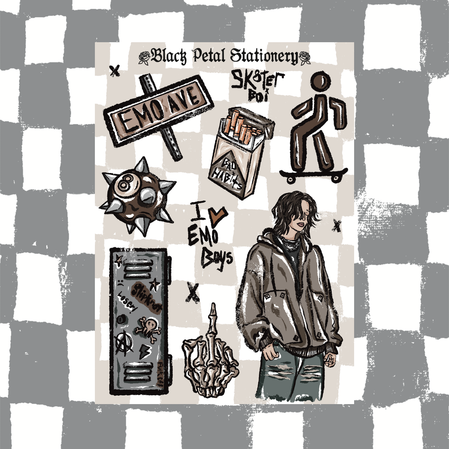 this sticker sheet is part of the sk8ter collection, designed, drawn and made by me. it is made on standard sticker paper and it is not water proof.