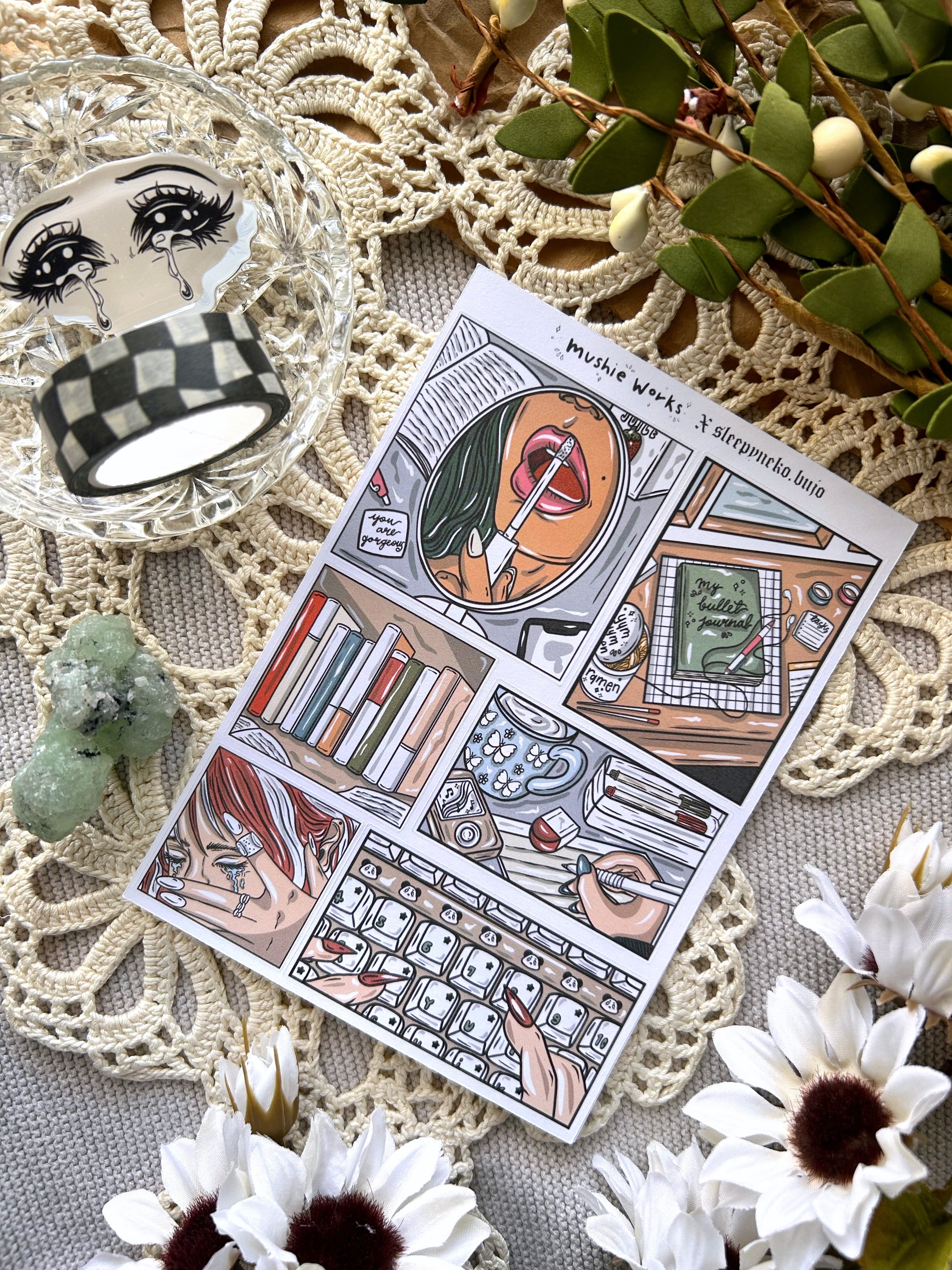 The sticker sheets are hand drawn and cut by myself and can not be distributed without my permission. The sheets is a 4.3x6